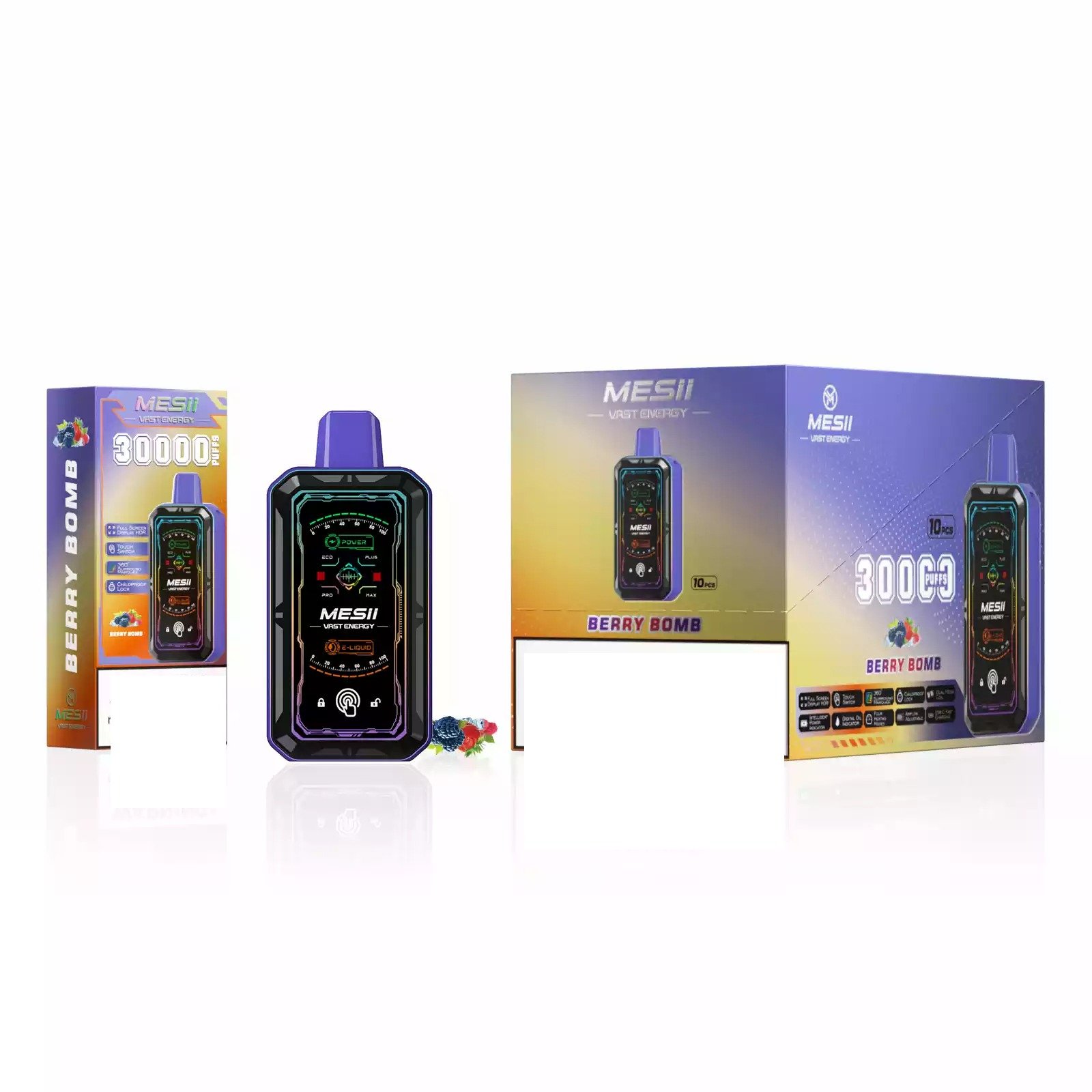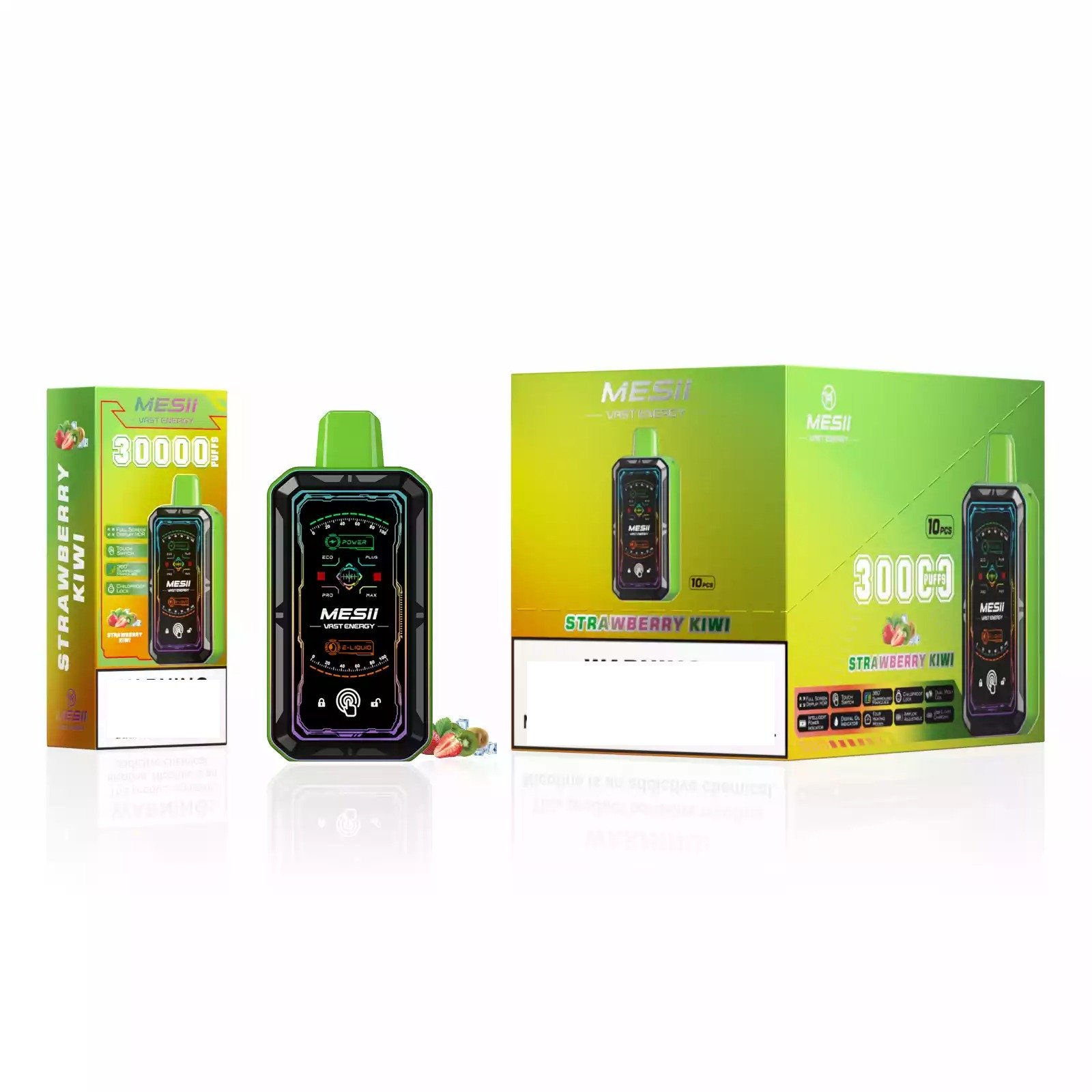 The MESII VAST ENGERGY 30000 Puffs with its rechargeable 800mAh battery, dazzling 360° LED light, and dual touch/physical controls – choose from 15 bold tastes and 4 strengths (0%-5%), exclusively for European wholesalers at VapeNex.